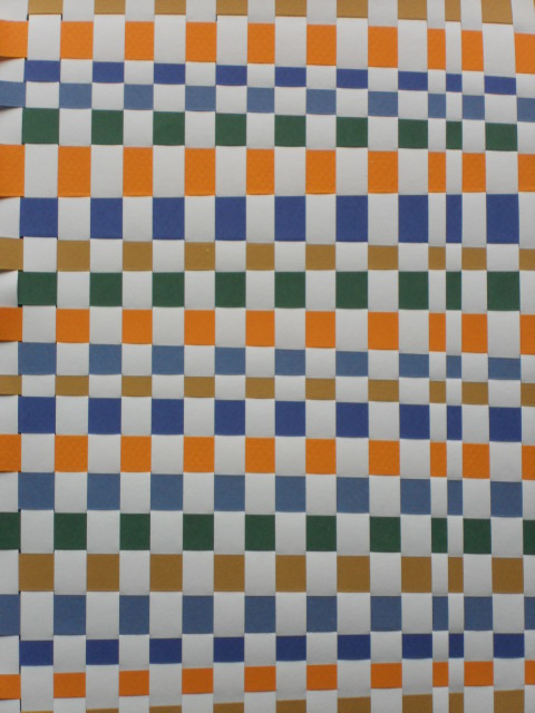 Non, je n'ai pas fait de gabarits... Le papier blanc est coupé tous les 15mm environ, en laissant 2 cm en haut de la feuille. Les feuilles de couleurs sont elles découpées par bande de la même largeur (environ). Les élèves ont "tissé" sur les feuilles blanches en calant une première bande vers le haut de la feuille blanche, puis une seconde bande en inversant le croisement dessus/dessous, etc...<br />